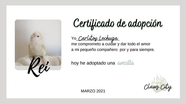Hemos preparado una muestra en donde irá el certificado general de adopción, con un pequeño compromiso de responsabilidad y afecto para todo animalito que sea adoptado.